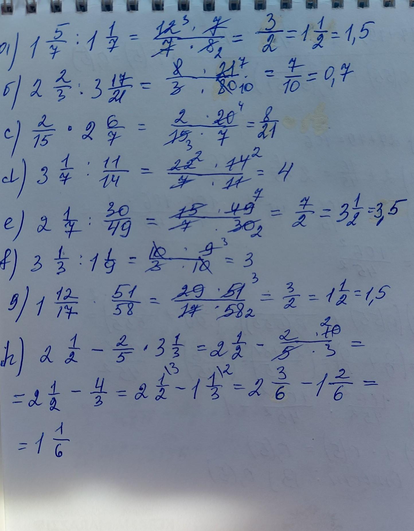 e) 2 1/7÷30/49=15/7÷30/49=15/7×49/30=7/2