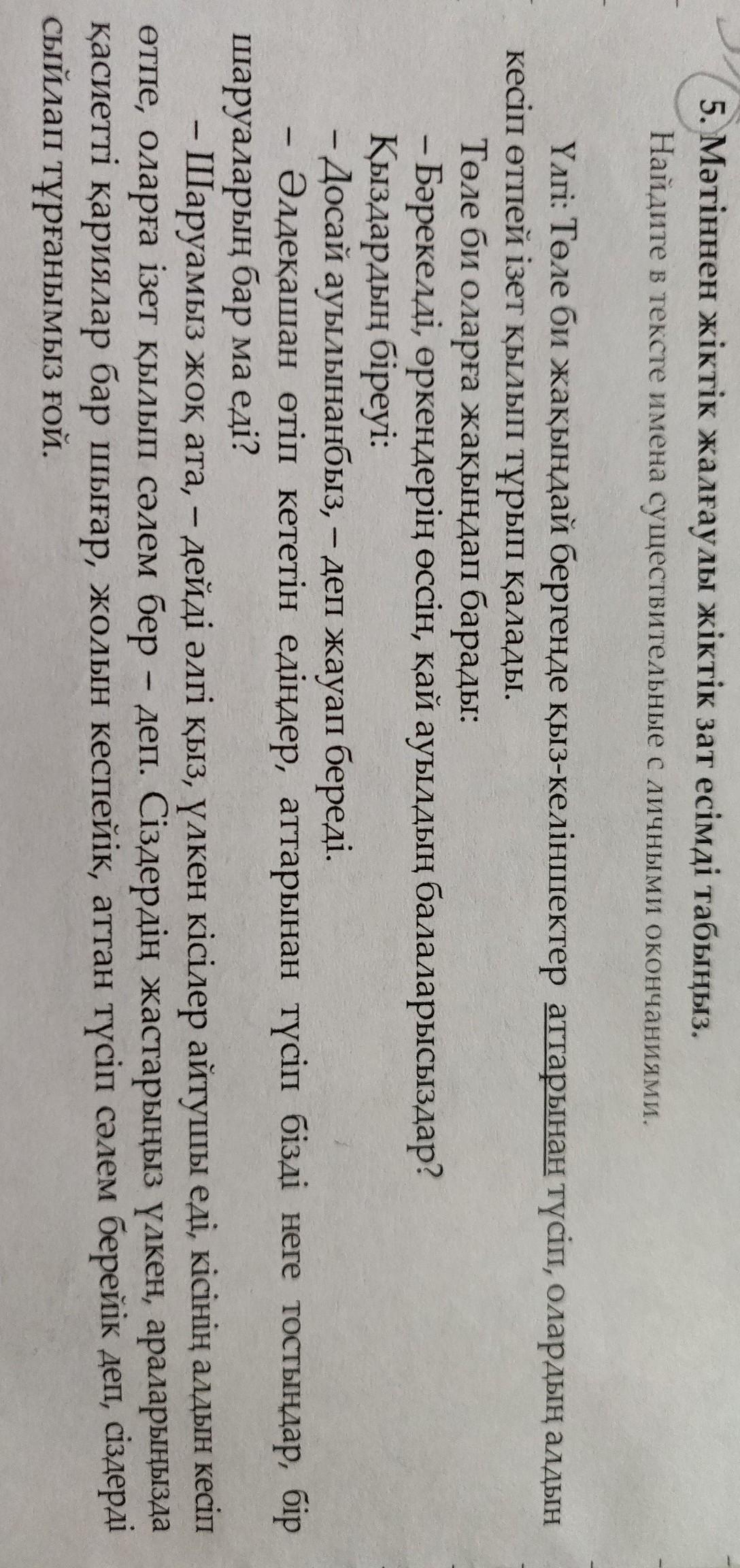 Мәтіннен жіктік жалғаулы жіктік зат есімді табыңыз. Найдите в тексте имена существительные с личными окончаниями. Үлгі: Төле би жакындай бергенде қыз-келіншектер аттарынан түсiп, олардын алдын кесіп өтпей ізет кылып тұрып қалады. Төле би оларға жақындап барады: – Бәрекелді, өркендерің өссін, қай ауылдың балаларысыздар? Қыздардың біреуі: - Досай ауылынанбыз, – деп жауап береді. Әлдеқашан өтіп кететін едіңдер, аттарынан түсіп бiздi неге тостындар, бір шаруаларың бар ма еді? - Шаруамыз жоқ ата, – дейді әлгі қыз, үлкен кісілер айтушы еді, кісінің алдын кесiп өтпе, оларға ізет қылып сәлем бер - деп. Сіздердің жастарыңыз үлкен, араларыңызда қасиетті қариялар бар шығар, жолын кеспейік, аттан түсіп сәлем берейік деп, сіздерді сыйлап тұрғанымыз ғой.