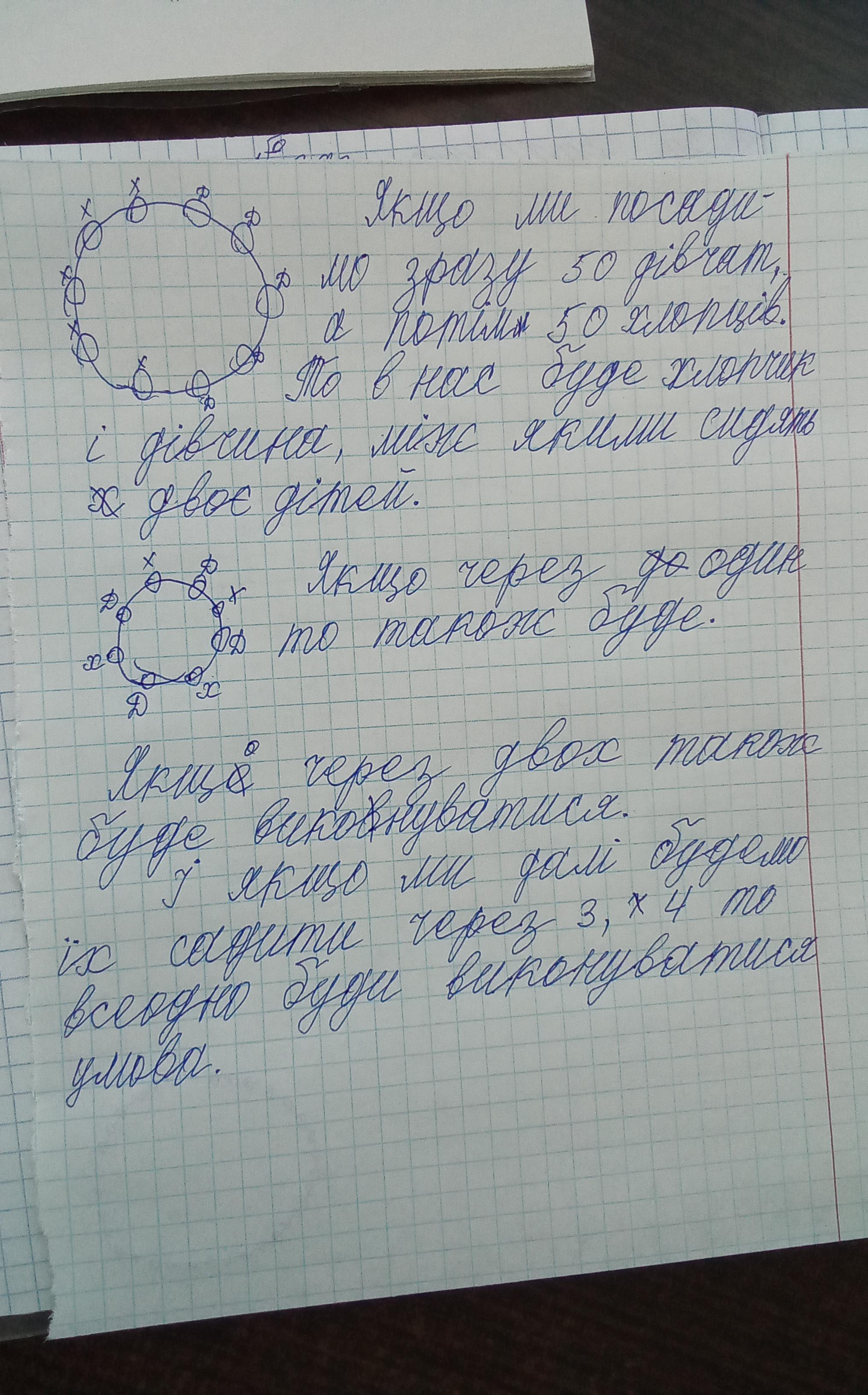 100 дітей сидять по колу: 50 хлопців та 50 дівчат. Доведіть, що буде хлопчик і дівчинка, між яким сидять рівно двоє дітей, і це також хлопчик і дівчинка.