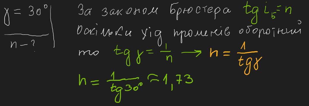 визначити показник заломлення скла якщо при відбиванні від нього світла відбивний промінь буде маскимально поляризований при куті заломлення 30°
