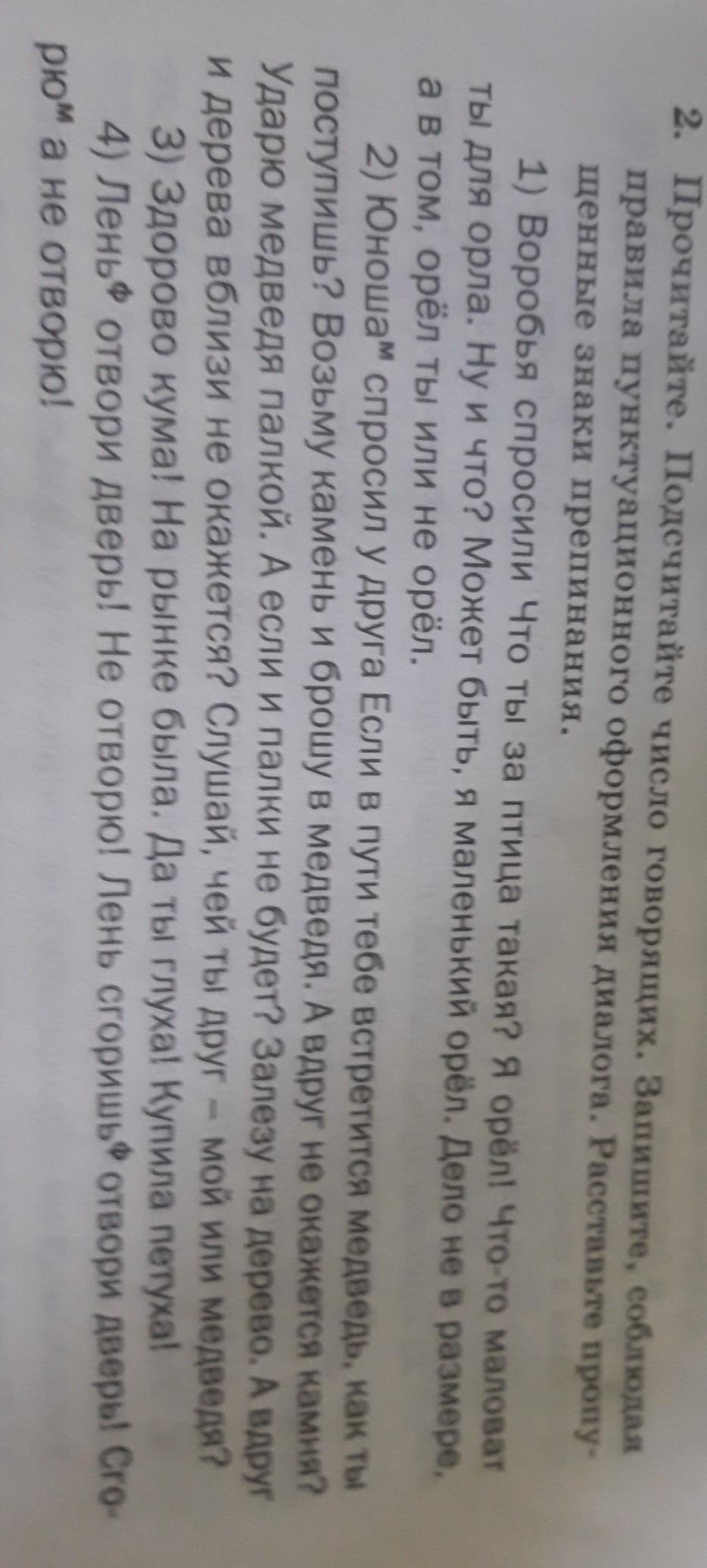 Прочитайте. Подсчитайте число говорящих. Запишите, соблюдая правила пунктуации оформления диалога. Расставьте пропущенные знаки препинания.