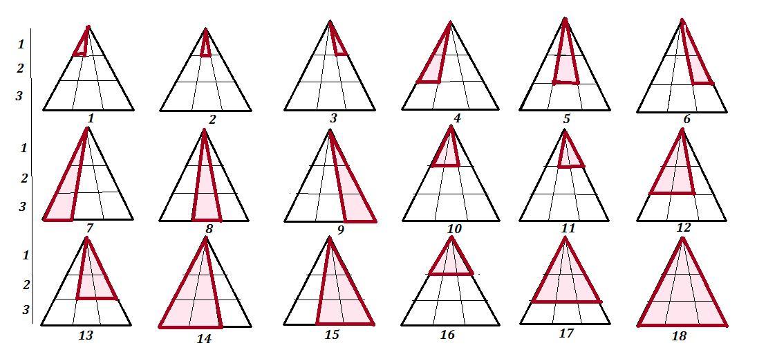 + шестирных тр-ков = 2 тр-ка в 1+2+3 рядах по вертикали и 1 тр-к в 1+2 рядах , всего 3 треугольника ( рис. 14, 15 , 17 ) +