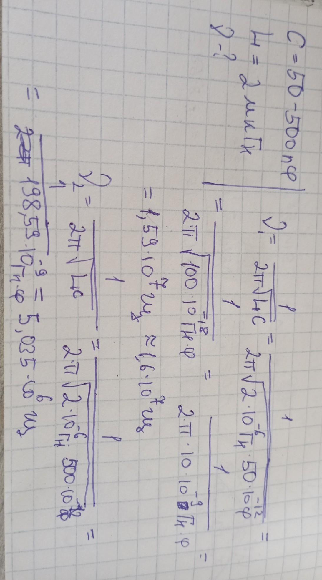 На якій частоті може працювати приймач , якщо ємність конденсатора коливальному контурі може змінюватися від 50 до 500 пф , а індуктивність котушки стала і дорівнює 2 мкГн