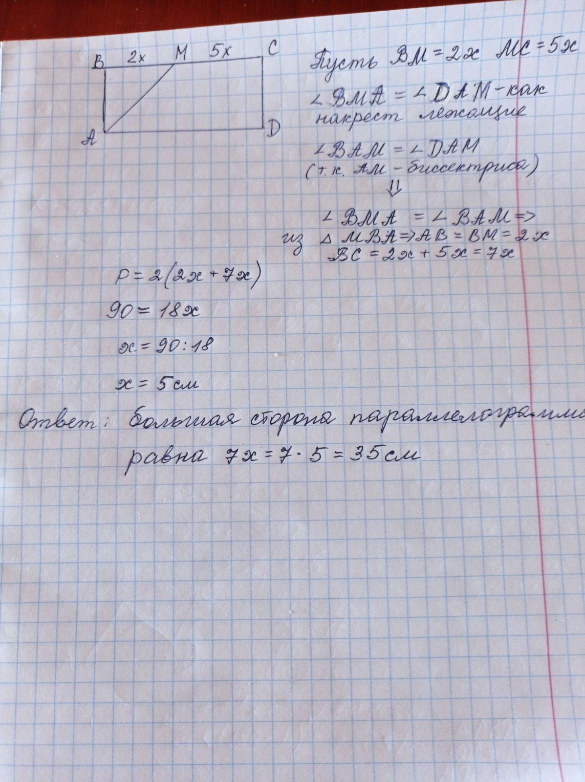 . В параллелограмме ABCD периметр равен 90, биссектриса угла BAD делит сторону ВС в отношении 2:5, считая от вершины В. Найдите большую сторону параллелограмма.