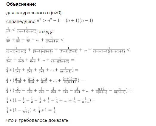 Докажите ,что для любого натурального числа n справедливо неравенство :1/3^2+ 1/5^2 + 1/7^2 + .... 1/(2n + 1)^2 < 1/4