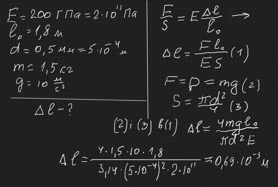 До залізного дроту діаметром 0,5 мм і довжиною 1,8 м підвішено вантаж 1,5 кг. На скільки видовжиться дріт?
