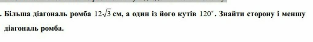 Большая диагональ ромба 12√3 см, а один из его углов 120°. Найти сторону и меньшую диагональ.