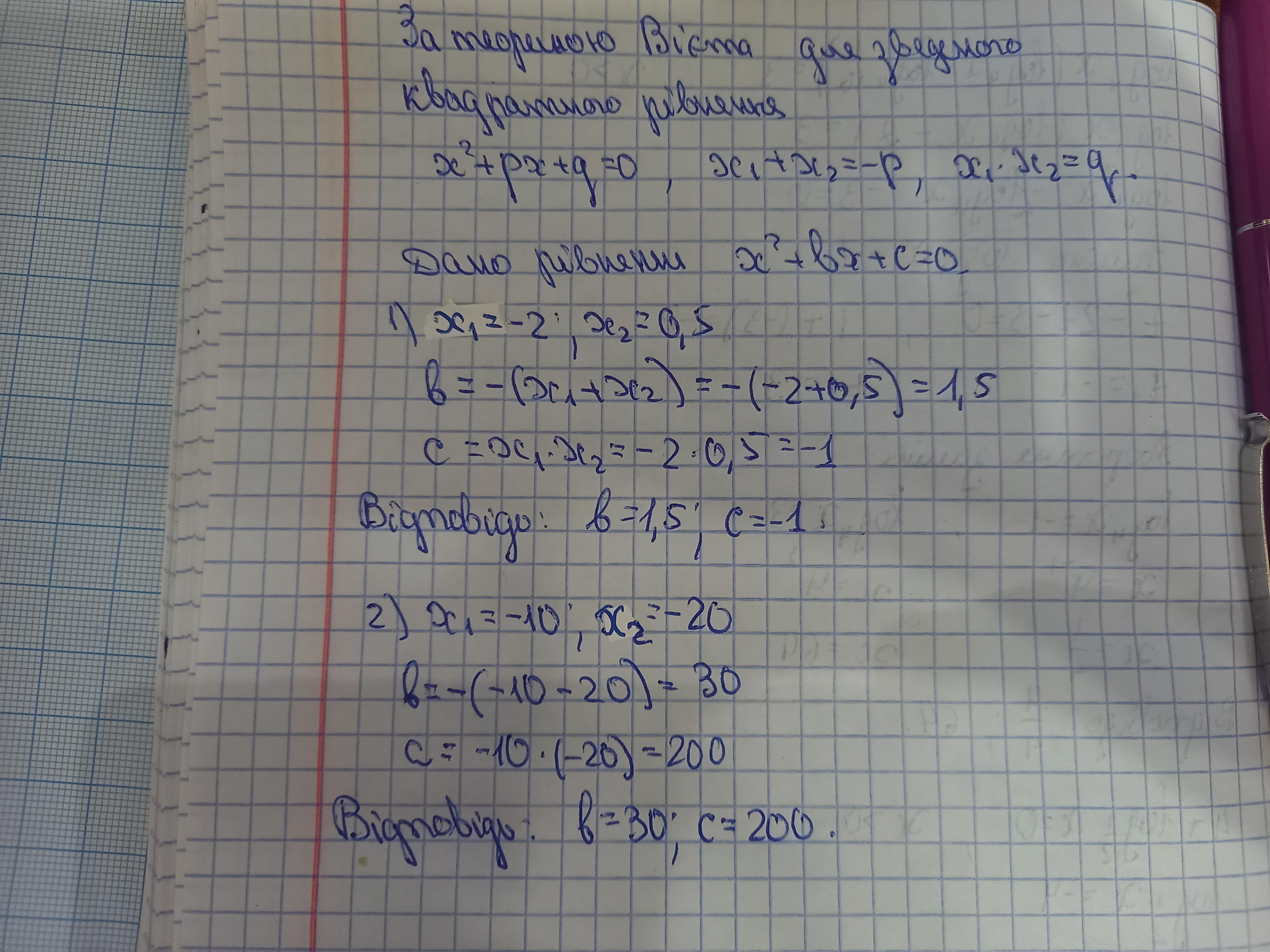 Знайдіть коефіціенти b i с рiвняння х² + bx + c = 0 , якщо його коренями є числа : 1 ) -2 і 0,5 2)-10 і -20