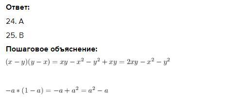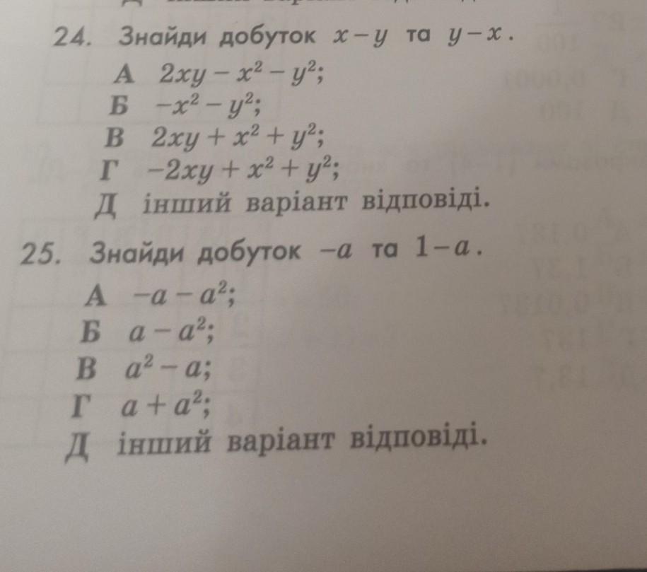24. Знайди добуток х-у та у-х. - Б A 2xy - x2 - у2; -х2 - у2; 2xy + x2+y2; -2xy + x2+y²; r Г Д інший варіант відповіді. B 25. Знайди добуток -а та 1-a. A -a - a²; Б a-a²; a² - a; ra+a²; д інший варіант відповіді. B 00