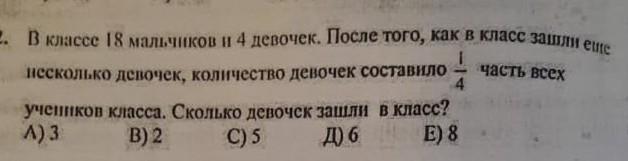 В классе 18 мальчиков и 4 девочек. После того, как в класс зашли ещё несколько девочек , количество девочек составило 1/4 часть всех учеников класса. Сколько девочек зашли в класс?
