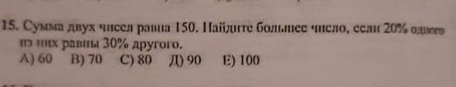 15. Сумма двух чисел равна 150. Найдите большее число, если 20% из них равны 30% другого.