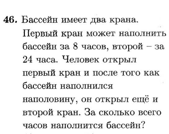 46. Бассейн имеет два крана. Первый кран может наполнить бассейн за 8 часов, второй 24 часа. Человек открыл первый кран и после того как бассейн наполнился наполовину, он открыл ещё и второй кран. За сколько всего часов наполнится бассейн?