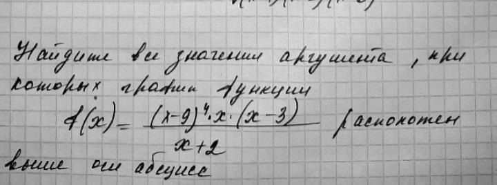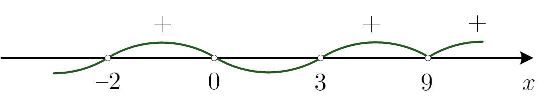 Для этого стоит воспользоваться методом интервалов. Схематически наносим в правильном порядке на числовую прямую точки, превращающие в ноль каждый из сомножителей числителя и знаменатель: 9, 0, 3, –2. Берем любое число правее самого правого (9) и, подставляя в функцию, определяем ее знак. Например, при знаки всех сомножителей числителя и знаменателя положительны, значит и значение дроби будет положительным. Значит запускаем «змейку» сверху. Проходя через каждую из точек 0, 3 и –2, «змейка» будет менять свое положение относительно числовой прямой. Проходя через точку 9 (за счет четной степени у скобки) — не будет. Действительно, взяв любое значение аргумента в промежутке от 3 до 9 можно проверить, что значение функции останется положительным.