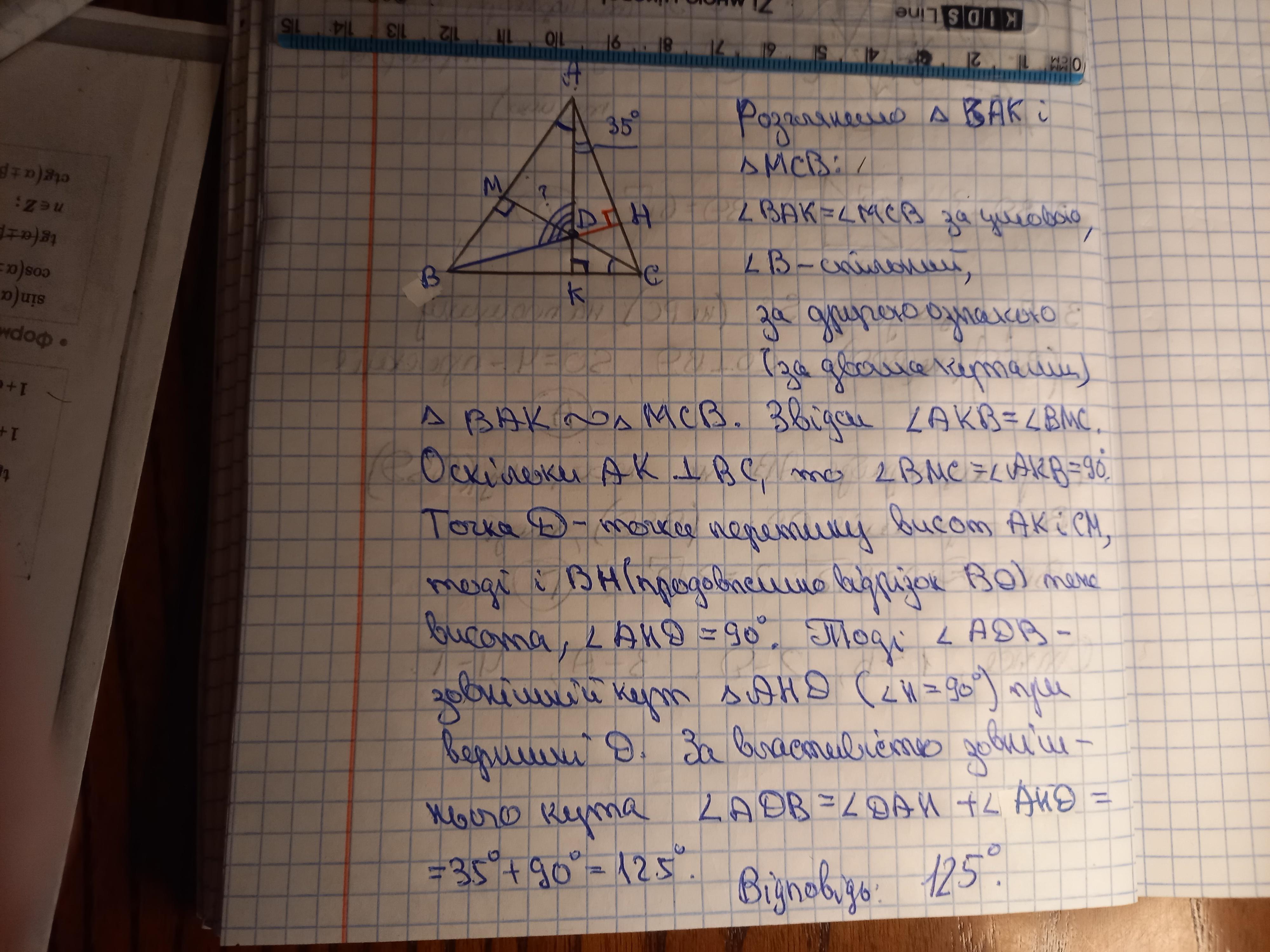 Вiдрiзок АК-висота гострокутного трикутника АВС. На стороні АВ позначили точку М так, що ВАК=МСВ.Вiдрiзки AK і СМ перетинаються в точці D. Відомо, що