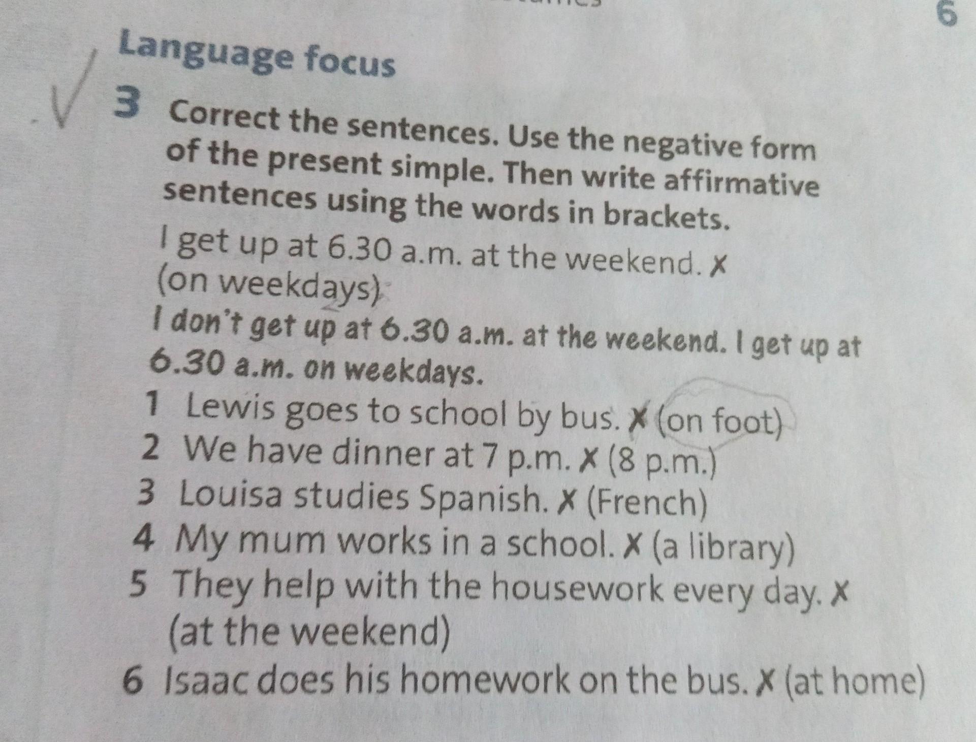 6. Isaac doesn't do his homework on the bus. He does his homework at home.