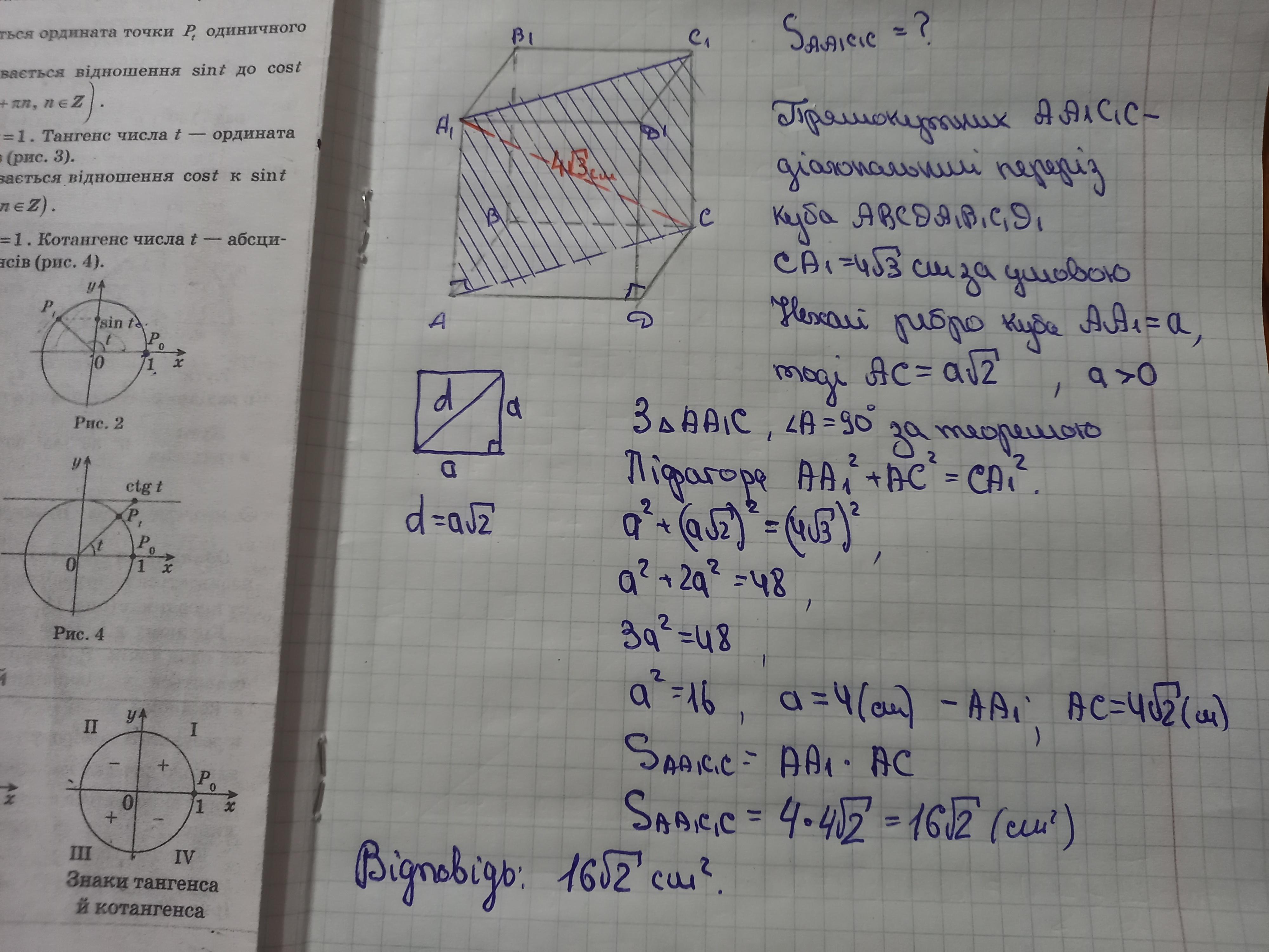 Діагональ куба дорівнює 4√3 см. Знайдіть площу його діагонального перерізу.