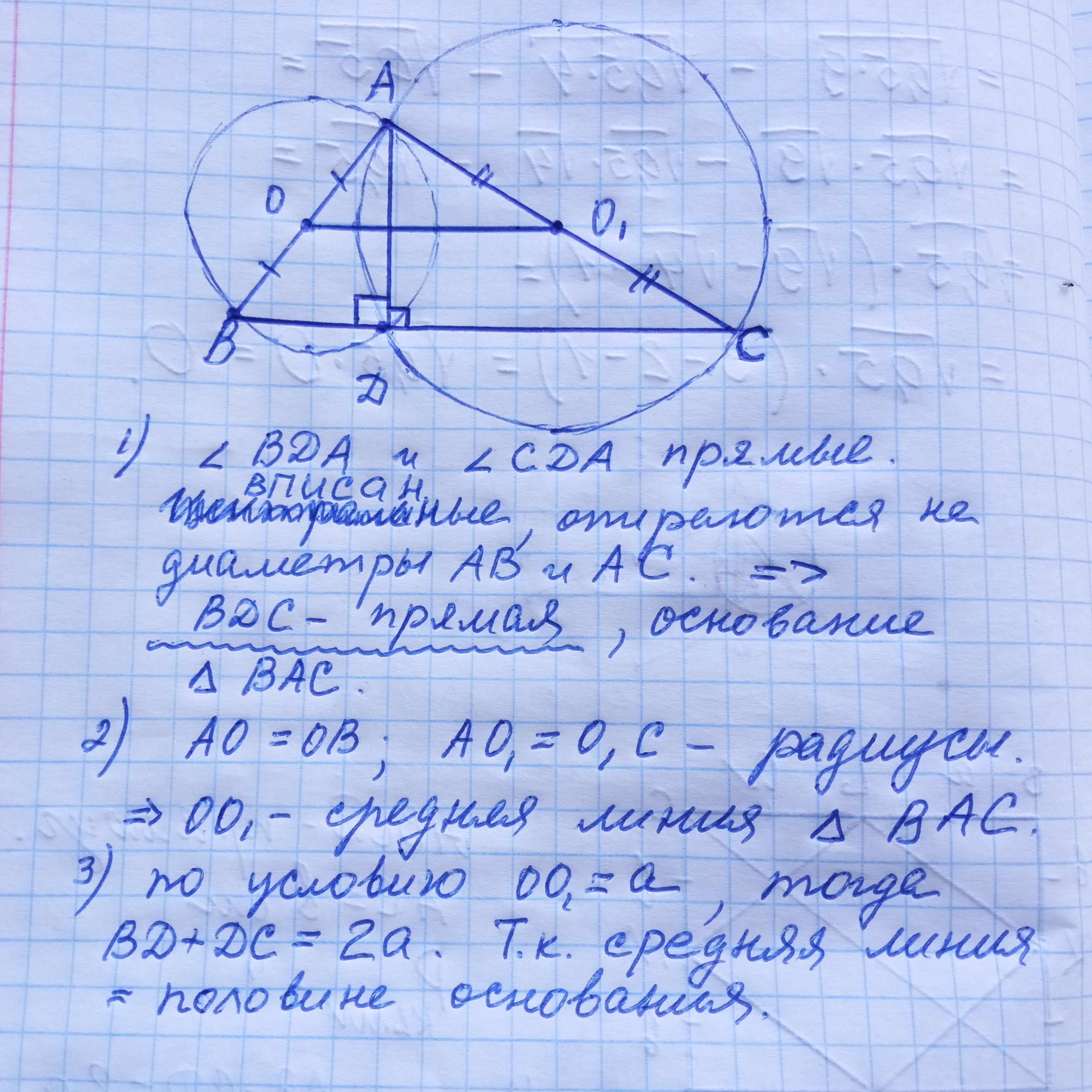 две окружности пересекаются в точках A и D. Проведены диаметры АВ и АС этих окружностей. Найдите BD+DC, если расстояние между центрами окружностей равна a и центры окружностей лежат по разные стороны от общей хорды
