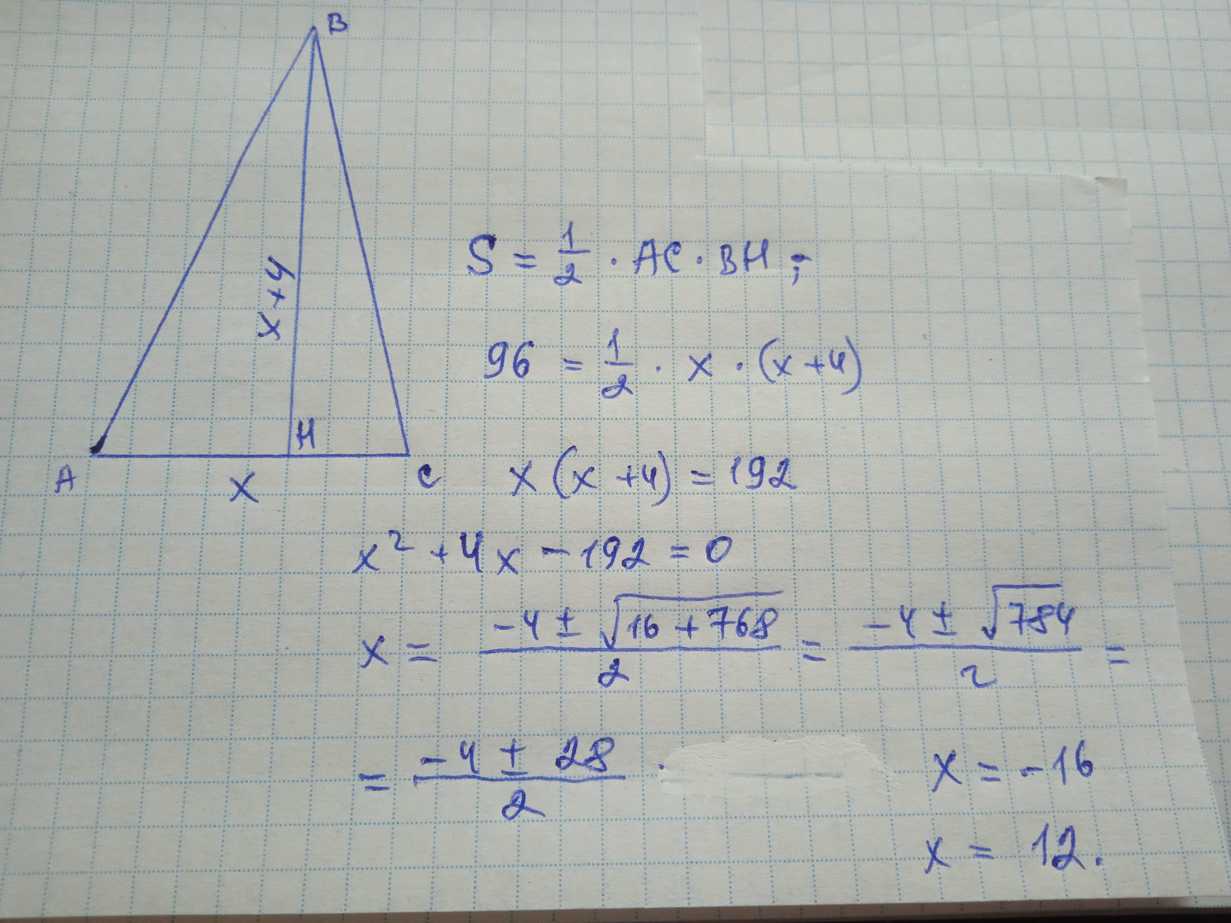 у трикутнику довжина сторони на 4 см менша, ніж довжина висоти, проведеної до неї. Знайдіть довжину цієї сторони, якщо площа трикутника дорівнює 96 см