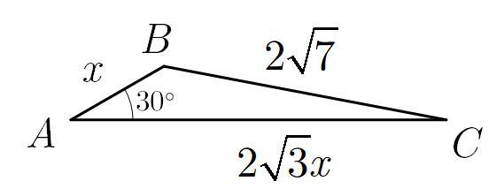 довжина сторони трикутника дорівнює 2корінь7 см, дві інші сторони утворюють утворюють кут 30 градусів, а їх довжини відносяться 1:2корінь3. Знайдіть найменшу із сторін трикутника