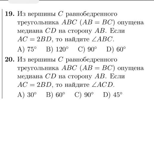 19) ∠ABC=60° , 20) ∠ACD=30°