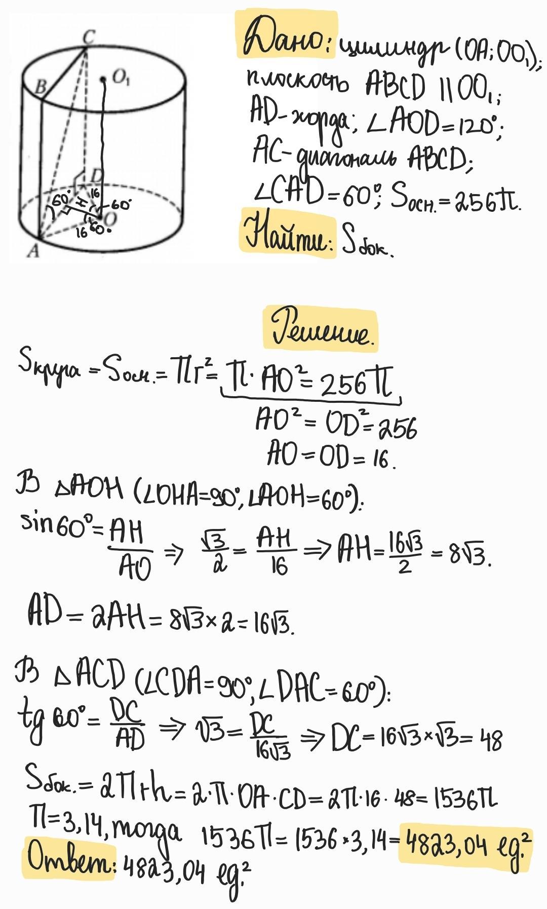 В цилиндре параллельно его оси проведена плоскость, пересекающая нижнее основание цилиндра по хорде, которую видно из центра этого основания под углом 120°. Диагональ полученного сечения наклонена к плоскости основания под углом 60°. Найти площадь боковой поверхности цилиндра, если площадь его основания равна 256π. (Ответ округлить до сотых, П=3.14