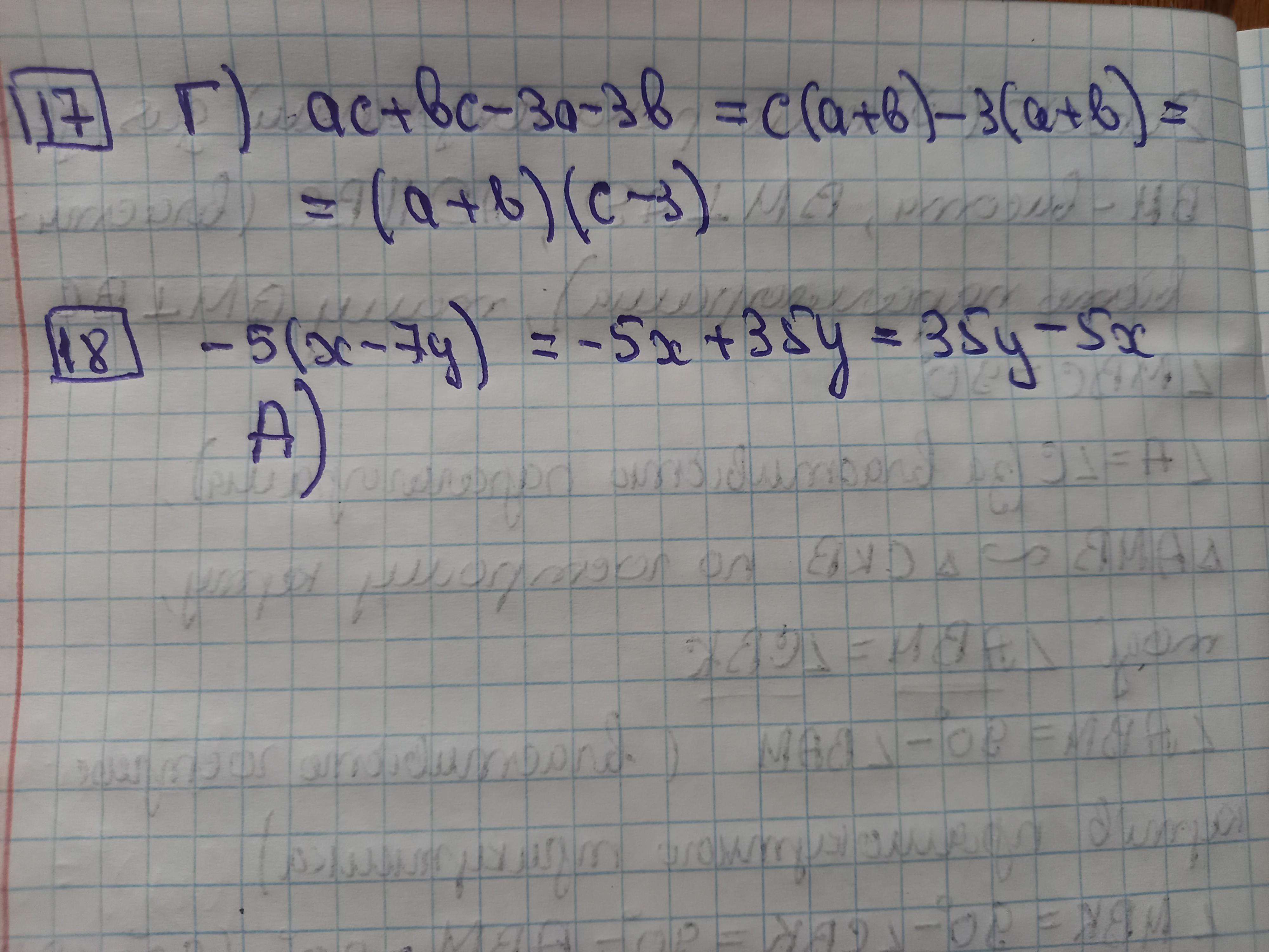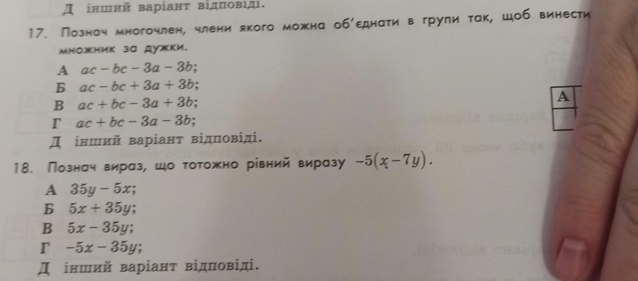 D Г -5; 2; 6; Д інший варіант відповіді. UV 17. Познач многочлен, члени якого можна об'єднати в групи так, щоб винести множник за дужки. A ac-bc-3a - 3b; Б ac-bc + 3а+ 3b; ac + bc - За + 3b; ас+ bc - 3а - 3b; в В г Д інший варіант відповіді. 18. Познач вираз, що тотожно рiвний виразу -5(x-7y). A 35у - 5х; Б 5х + 35у; 5x - 35у; -5х - 35у; Г Д інший варіант відповіді. Zmai 1 3uc A