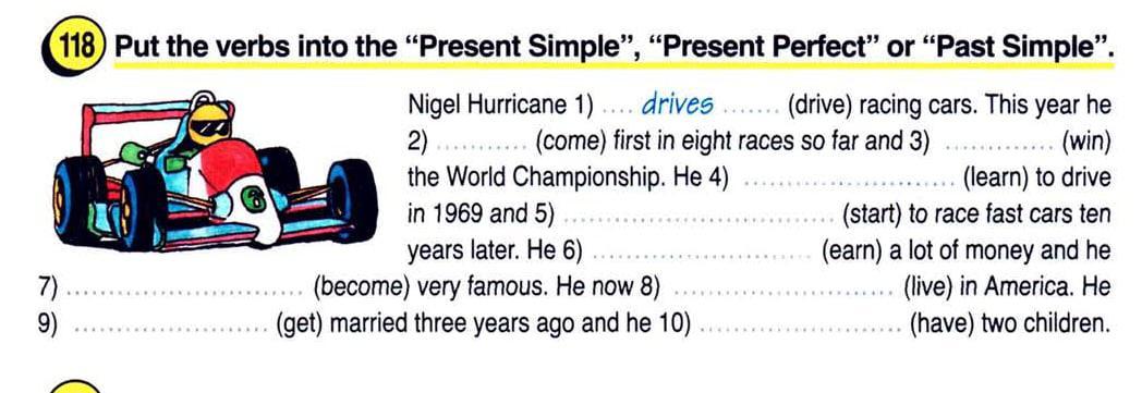 Nigel Hurricane 1) drives racing cars. This year he 2) has come first in eight races so far and 3) has won the World Championship. He 4) learnt to drive in 1969 and 5) started to race fast cars ten years later. He 6) has earned a lot of money and he 7) has become very famous. He now 8) lives in America. He 9) got married three years ago and he 10) has two children.