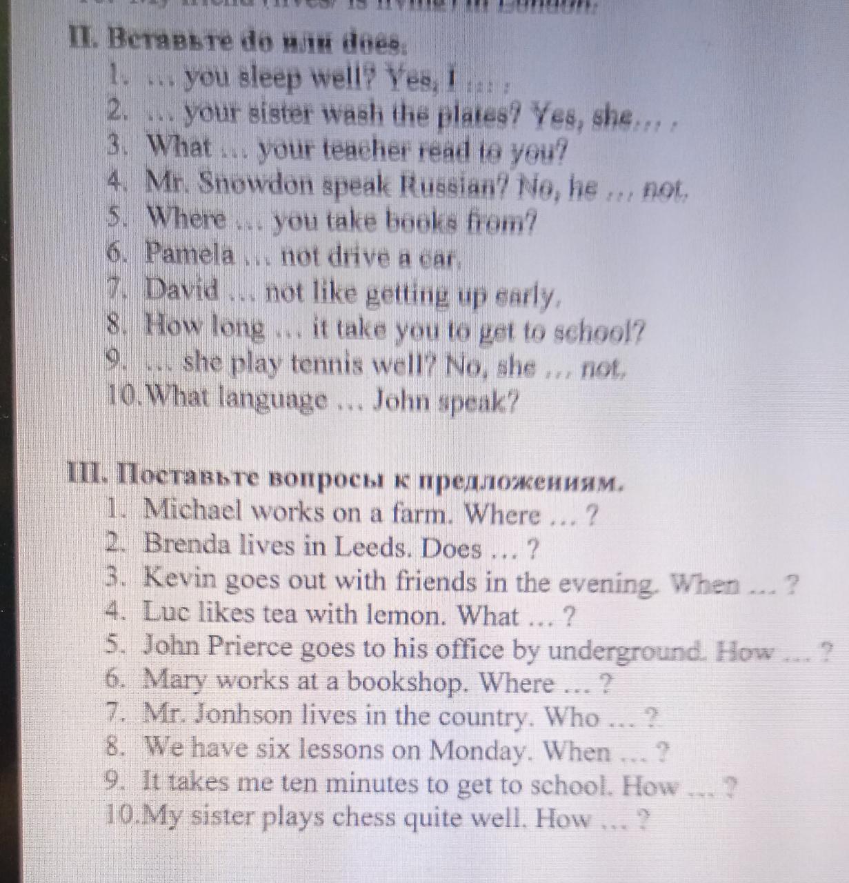 1. Вставьте do или does.1.DO you sleep well? Yes, I DO.2. DOES your sister wash the plates? Yes,she DOES.3. What DOES your teacher read to you?4. DOES Mr. Snowdon speak Russian? No,he DOES not,5. Where DO you take books from? 6. Pamela DOES not drive a car.7. David DOES not like getting up early.8. How long DOES it take you to get to school?9. DOES she play tennis well? No, she DOES not.10. What languages doES John speak?