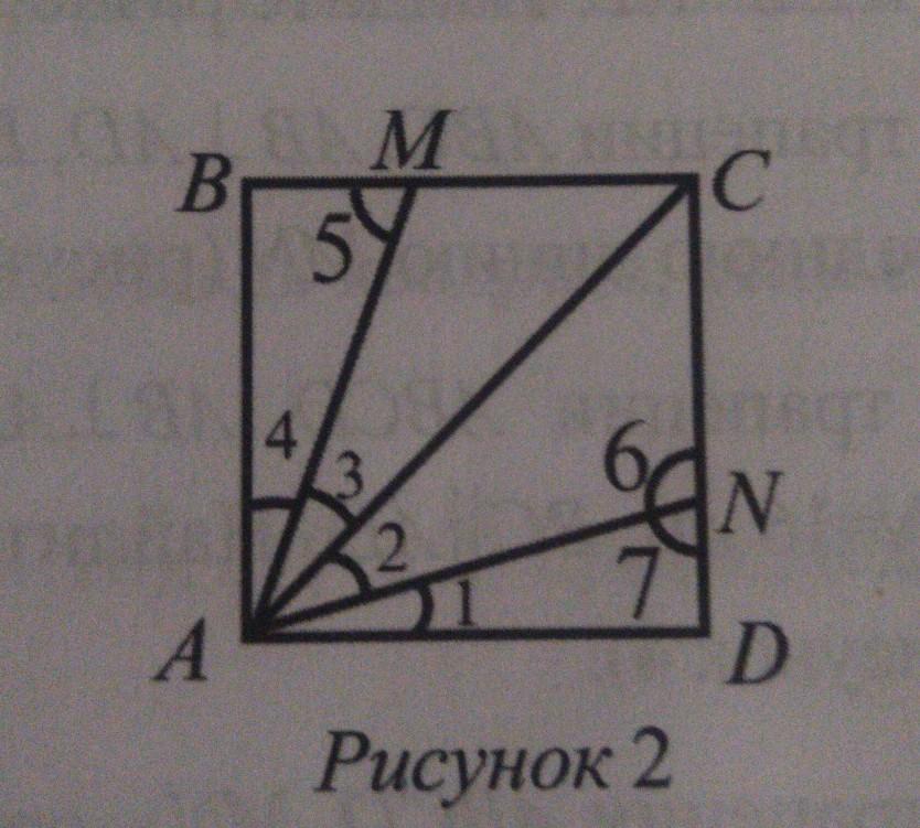 Но это можно также доказать как следствие из равенства треугольников ABM и ADN (По первому и второму условиям равенства треугольников [AB=AD,BM=DN, угол ABM равен углу ADN, угол 7 равен углу 5, угол 1 равен углу 4]