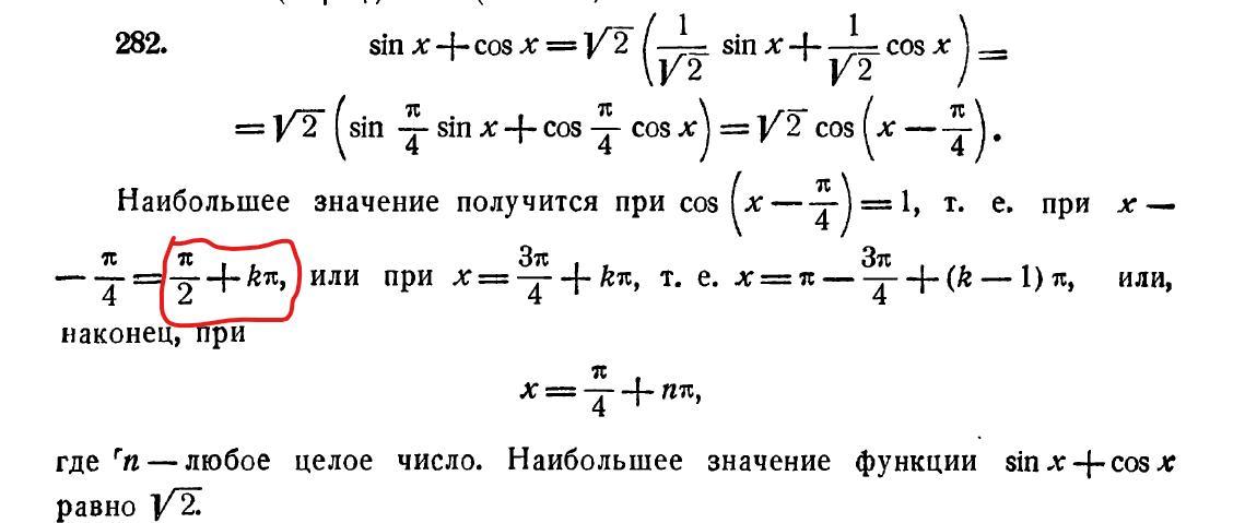 ну камон чел. Тут решается уравнение cos(x-п/4)=1. Когда косинус равен 1? Когда угол находится в верхней и нижней точки окружности, то есть когда угол равен п/2 + пк