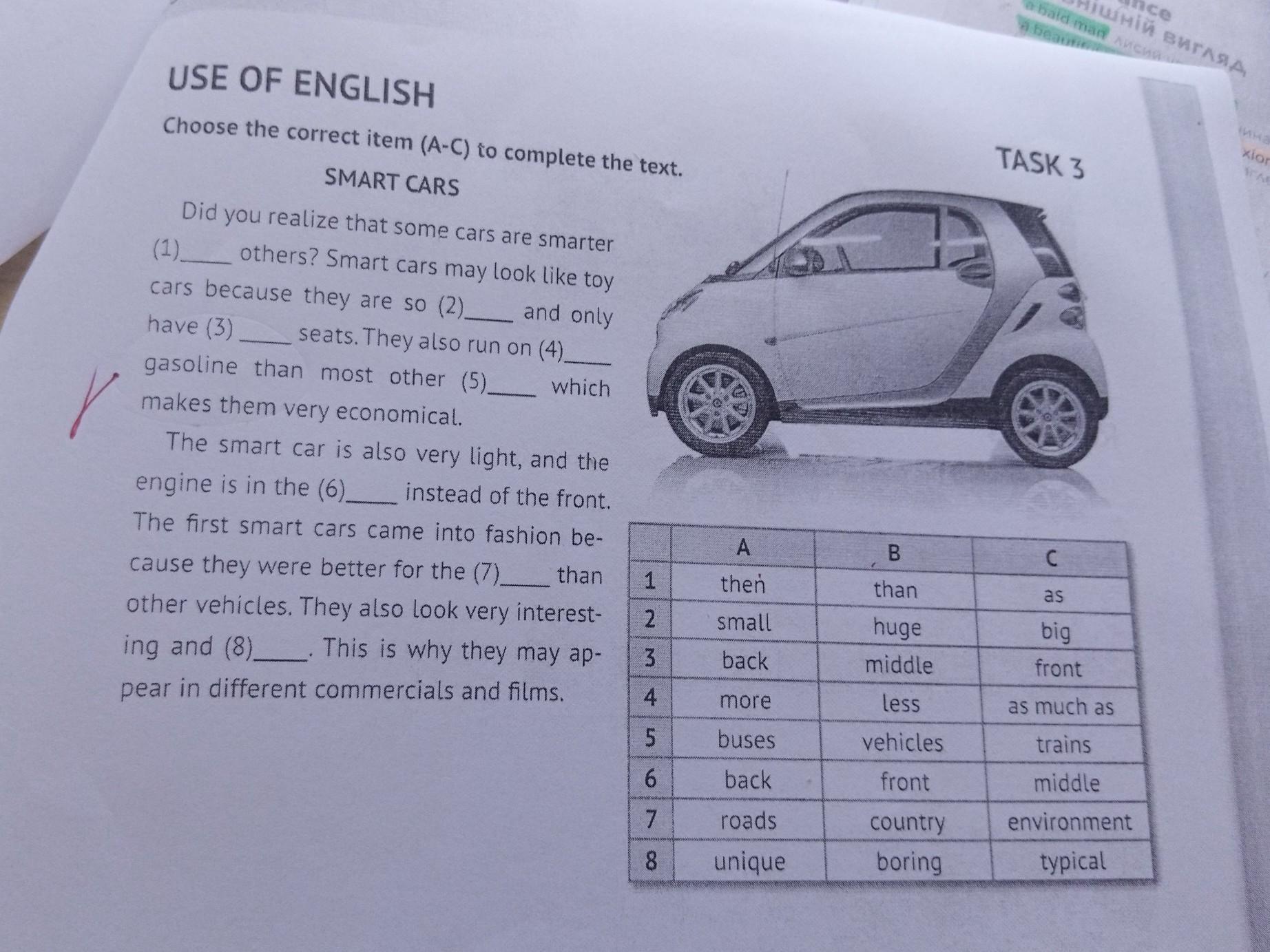 USE OF ENGLISH Choose the correct item (A-C) to complete the text. SMART CARS Did you realize that some cars are smarter (1)________ others? Smart cars may look like toy cars because they are so (2)_________ and only have (3) seats. They also run on (4)_________ gasoline than most other (5)_____ which makes them very economical. The smart car is also very light, and the engine is in the (6)________ instead of the front. The first smart cars came into fashion be- cause they were better for the (7)_________ than other vehicles. They also look very interest- ing and (8). This is why they may ap- pear in different commercials and films. 1 2 3 4 Ln 5 6 7 8 A then small back more buses back roads unique B than huge middle less vehicles front country boring TASK 3 C as big front as much as trains middle environment