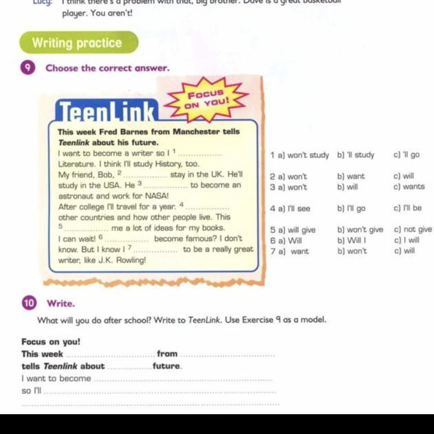 I want to become a writer so I'll study Literature. I think I'll study History too. My friend Bob won't stay in the UK. He'll study in the USA. He wants to become an astronaut and work for NASA!