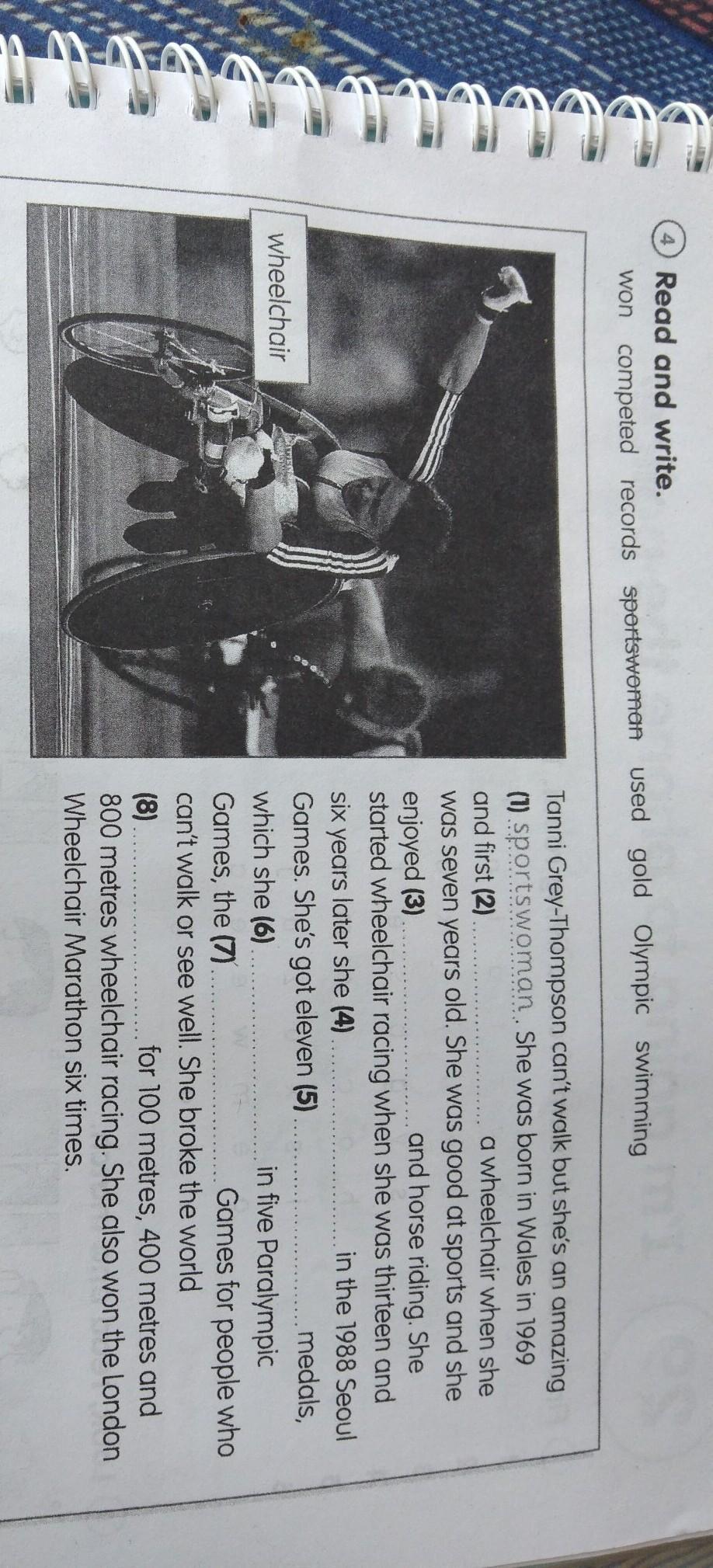 Read and complete the chart. Sport Favourite player Nationality Age Titles and medals Tennis I like playing tennis. I like watching it too. There are lots of great players but my favourite is Serena Williams. She was born in America in 1981 and started playing tennis when she was four years old. Today she's one of the best tennis players in the world and she's got 25 Grand Slam titles. She's also got two Olympic gold medals. One day I want to be a famous tennis player like Serena.