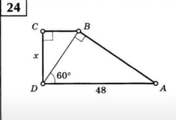 Конечно, условие, что вся фигура - трапеция, необходимо. Без этого найти х никак не получится. Но если это трапеция, то треугольники ABD и BCD подобны, (и угол D прямой, вы верно думали, именно это позволяет найти решение), и все считается устно. BD = 24 BC = 12 CD = 12√3;