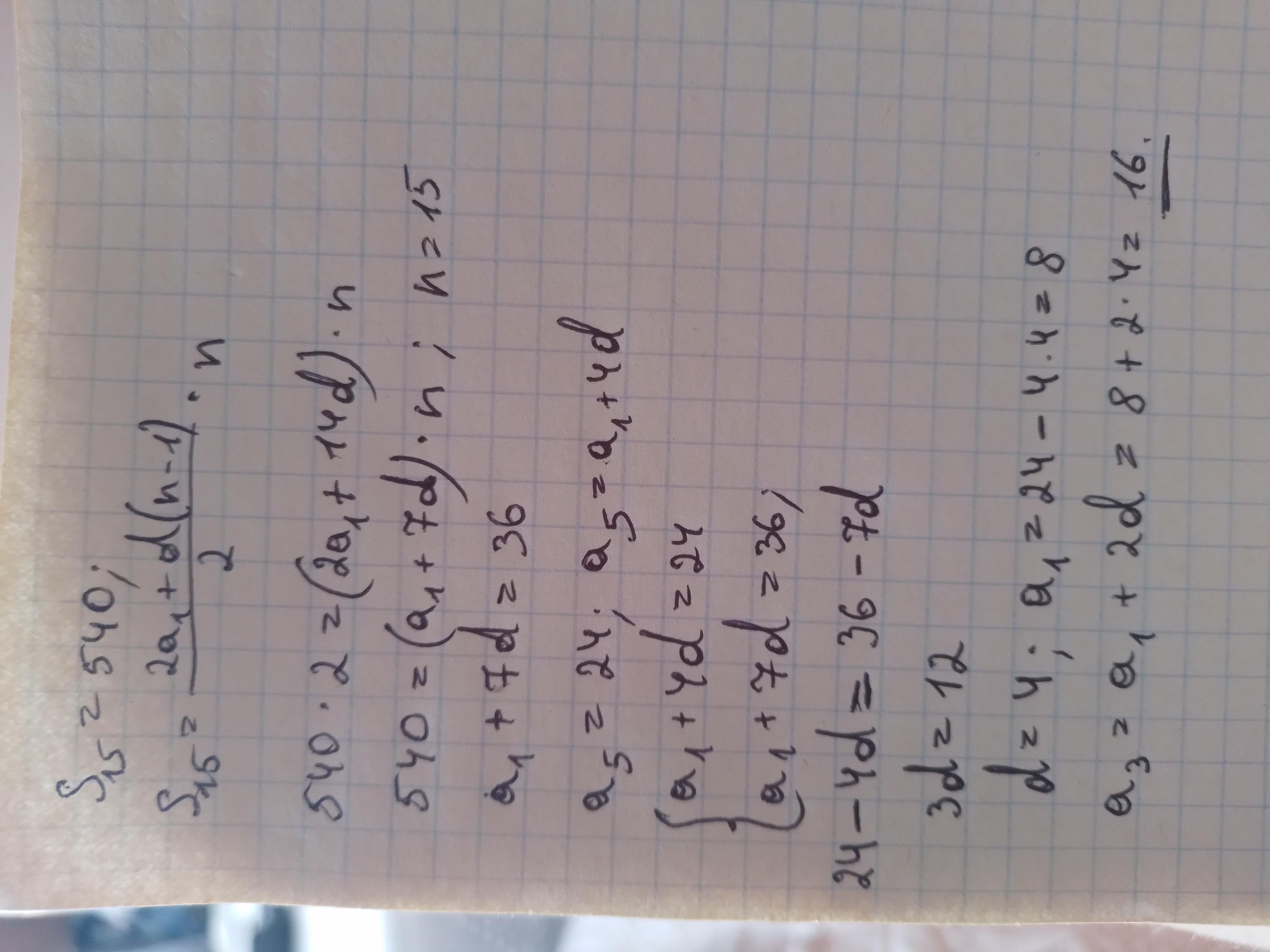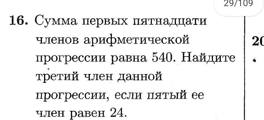 16. Сумма первых пятнадцати членов арифметической прогрессии равна 540. Найдите третий член данной прогрессии, если пятый ее член равен 24.