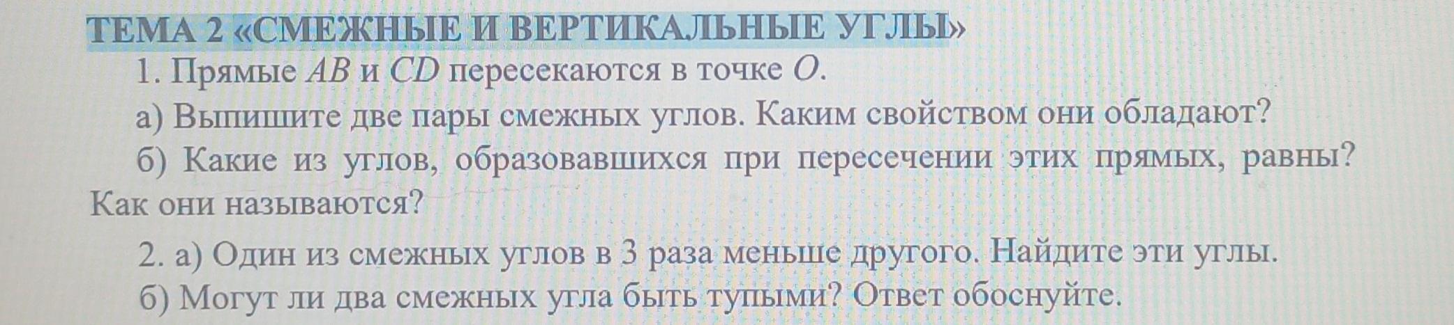 2. б) Нет, так как тупыми углом называют угол, больше чем 90°, то есть не менее 91°, а если их два, то сумма таких углов будет равна 182° (91°*2=182°), а по свойству смежных углов, их сумма составляет 180°<182°, откуда делаем вывод, что два смежных угла не могут быть тупыми.