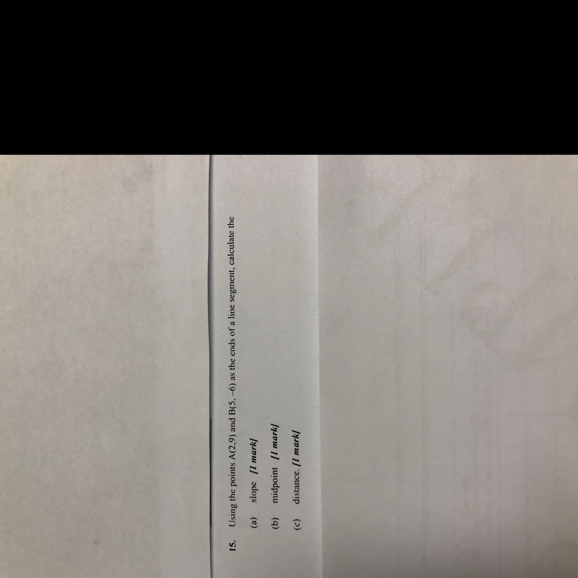 Используя точки А(2,9) и В(5,-6) как концы отрезка , рассчитайте : уклон,середину и расстояние.