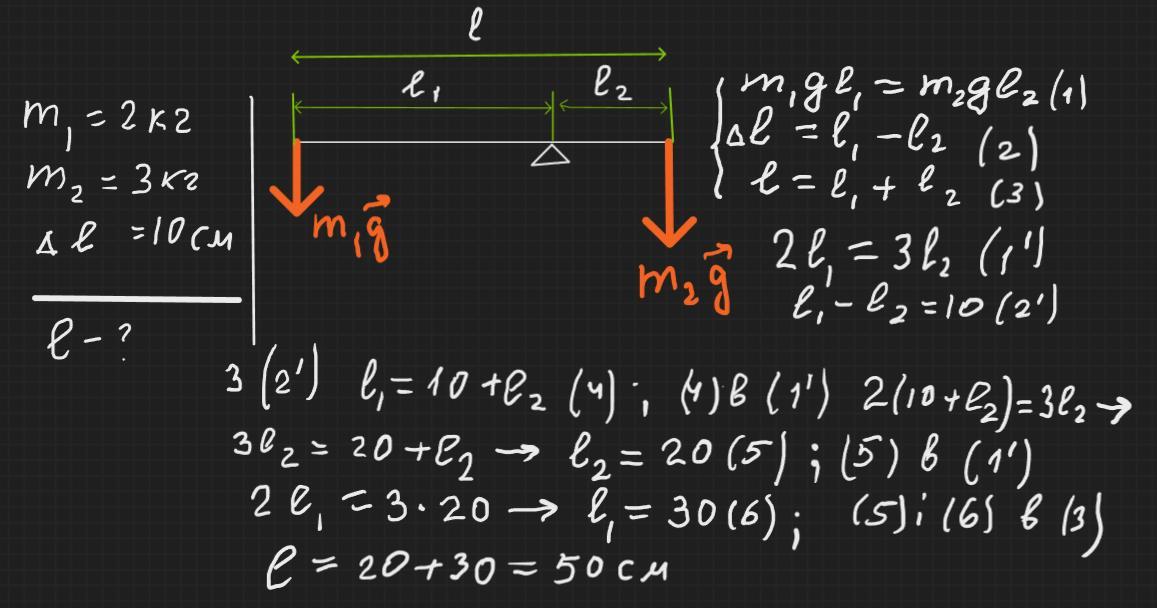 Легкий важіль, до кінців якого підвіщені вантажі масою 2 і 3 кг, перебуває в рівновазі. Визначте (у метрах) довжину важеля, якщо одне його плече на 10 см довше за друге