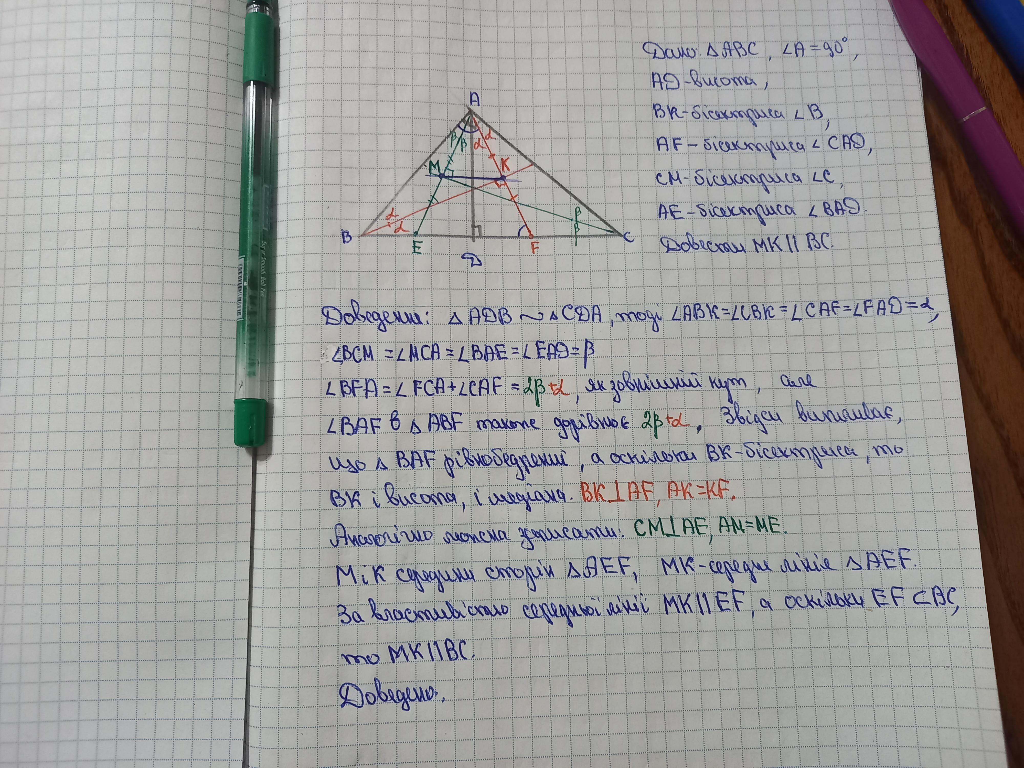 AD - висота прямокутного трикутника АВС. Бісектриса кутів В і CAD перетинаються в точці К, а бісектриси кутів С і BAD - у точці М. Доведіть, що КМ║ВС.