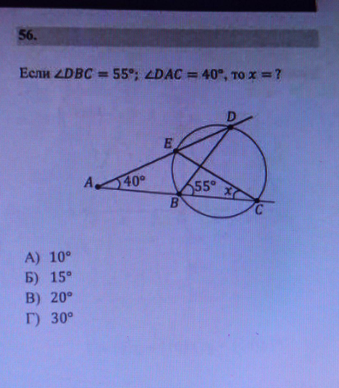Если угол DBC = 55градусов, угол DAC = 40градусов, то х=?