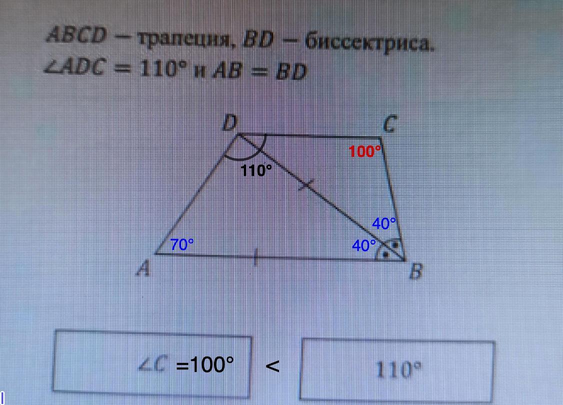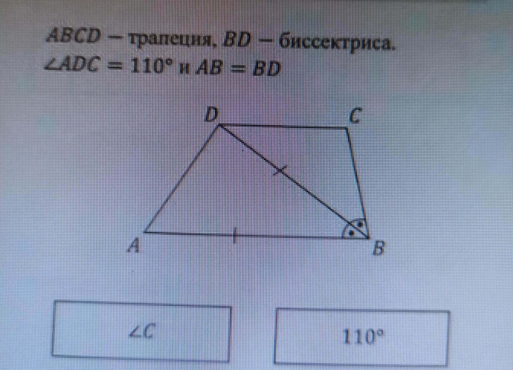 Если, ABCD-трапеция, ВD - биссектриса. угол ADC = 110° и AB = BD, то сравните: