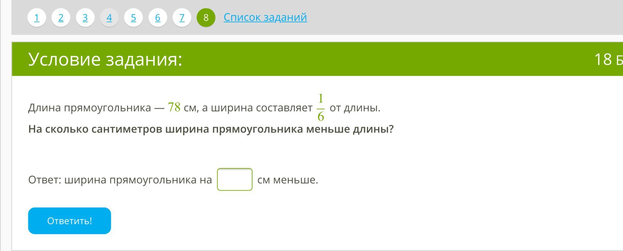 1) 78 * 1/6 = 78/6 = 13 (см) - ширина прямоугольника