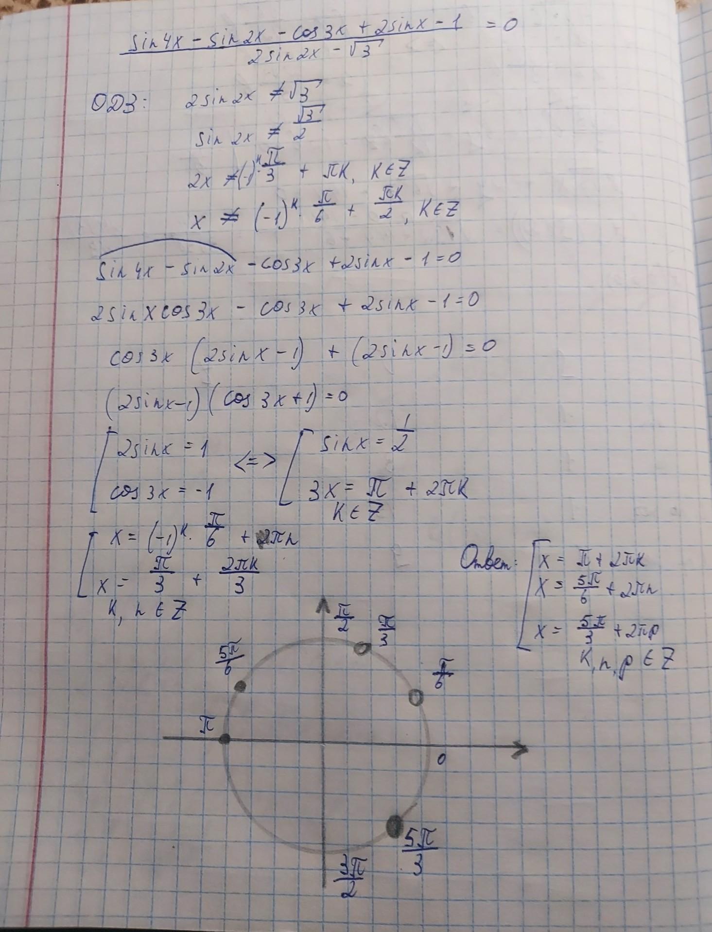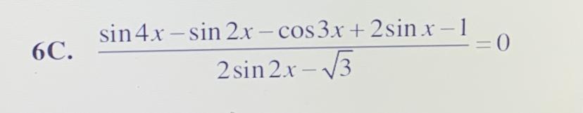 Числитель=2SinxCos3x -Cos3x +2Sinx -1 =Cos3x(2Sinx -1)+(2Sinx-1)=(2Sinx-1)(Cos3x+1); Ну и всё. (Не забудь про знаменатель#0).