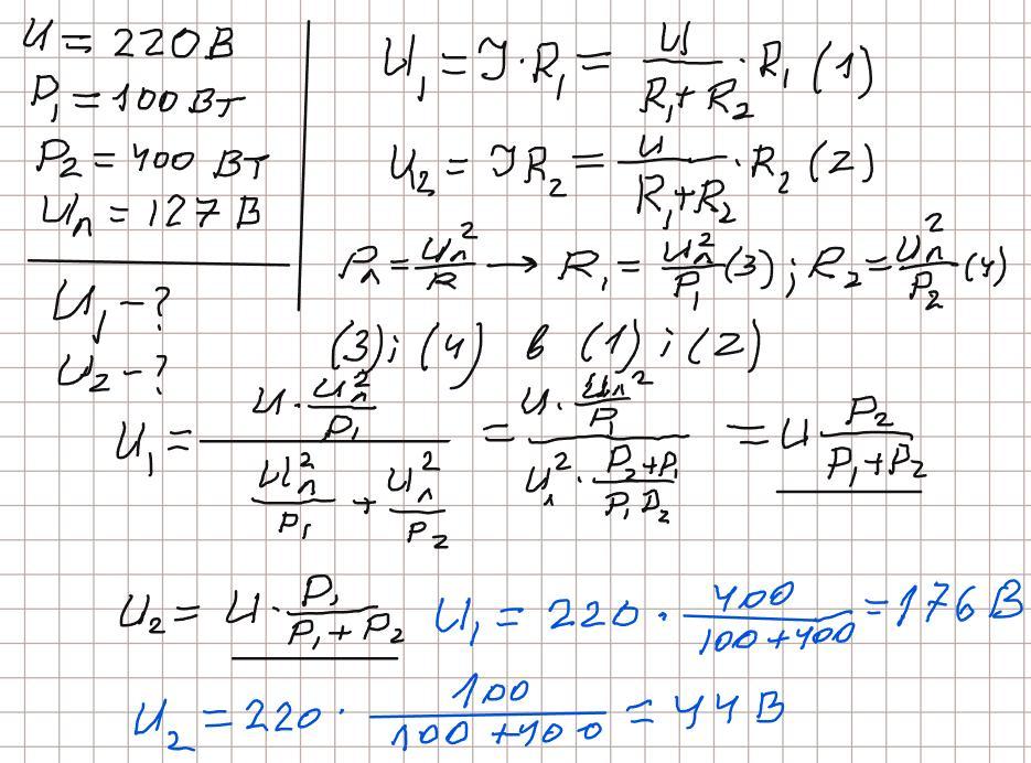 Срочно!!!У мережу напругою U=220 В включені послідовно дві електричні лампи потужністю P1=100вт і P2=400вт, розраховані на напругу Uл=127в. Яка напруга буде на кожній лампі?