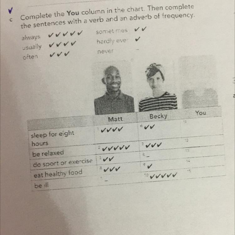 6. Becky sometimes sleeps for eight hours. 7. She is often relaxed. 8.She never does sport or exercises. 9. She hardly ever eats healthy food. 10. She is always ill