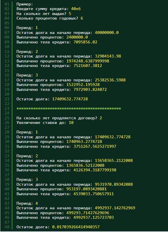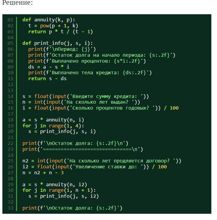 Кредит в сумме S млн руб., выданный на n лет под i% годовых, подлежит погашению равными ежегодными выплатами в конце каждого года, включающими процентные платежи и сумму в погашение основного долга. Проценты начисляются в один раз в год. После выплаты третьего платежа достигнута договорённость между кредитором и заёмщиком о продлении срока погашения займа на n_2 лет и увеличении процентной ставки с момента конверсии до i_2%. Напишите программу, которая выводит план погашения оставшейся части долга.