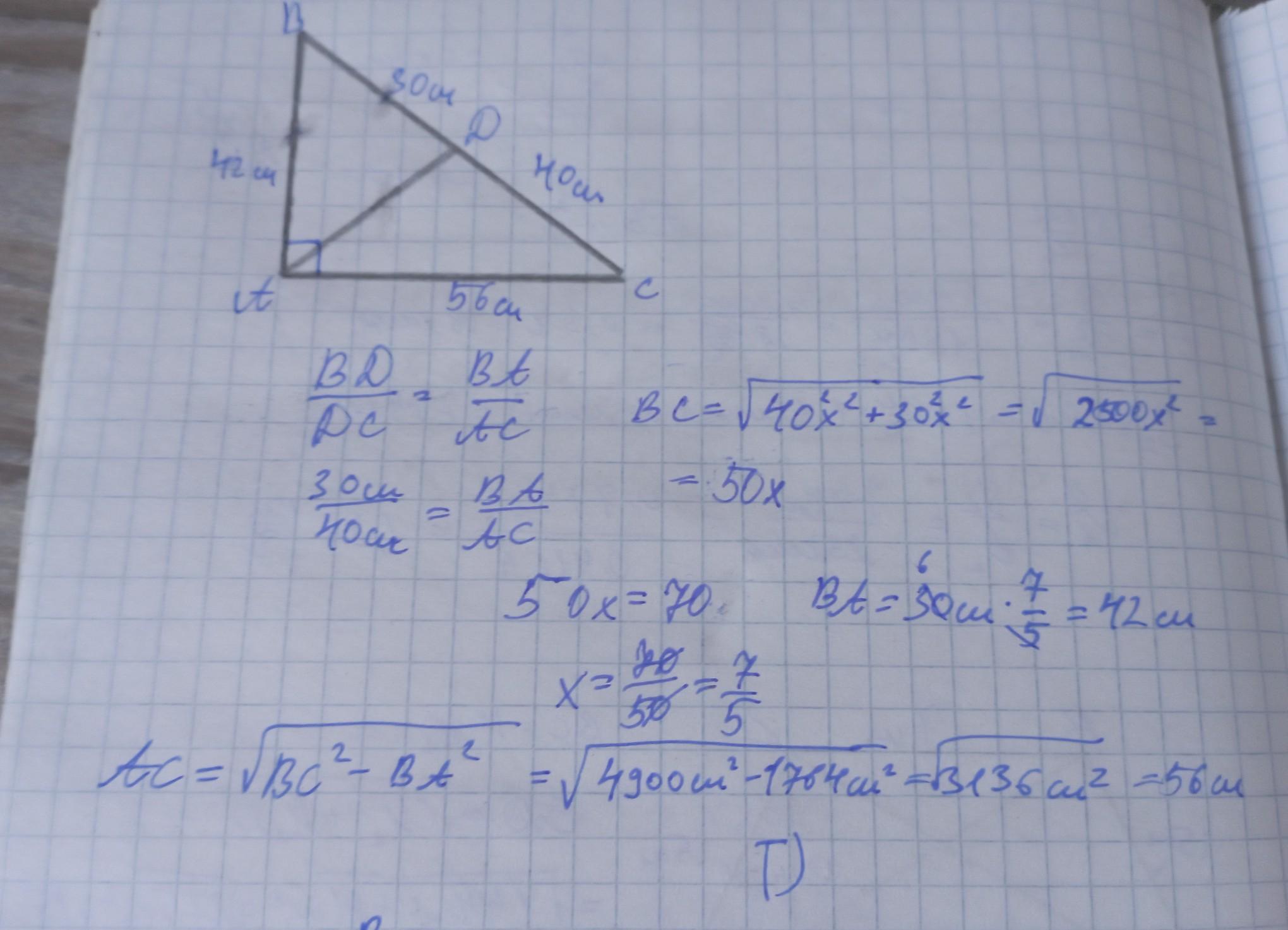 15. Биссектриса угла делит противоположную сторону на отрезки, пропорциональные прилегающим сторонам. Тогда катеты треугольника пропорциональны числам 30 и 40, значит относятся друг к другу как