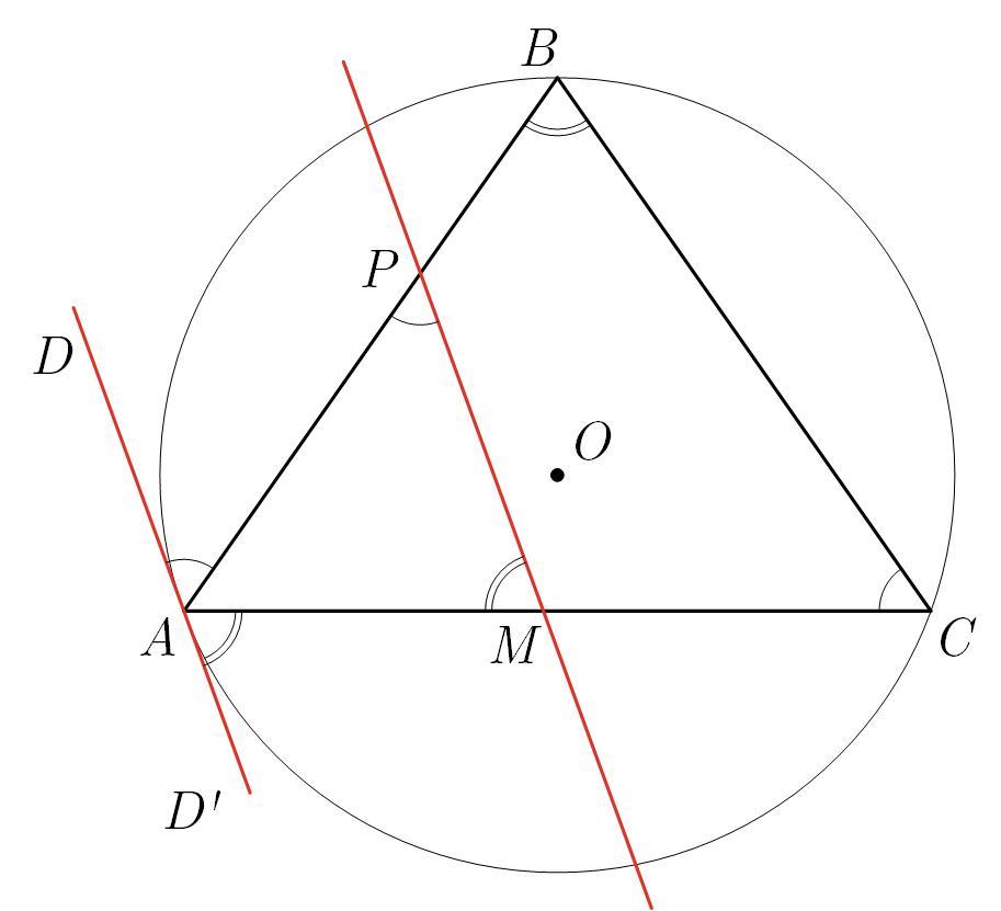 Пряма AD— дотична до описаного кола трикутника АВС. Пряма, паралельна цій дотичній, перетинає сторони AB i AC у точках р і М відповідно. Відомо, що кути АСВ i ABC дорівнюють відповідно 55° і 70°. Знайдіть кути трикутника АМР.