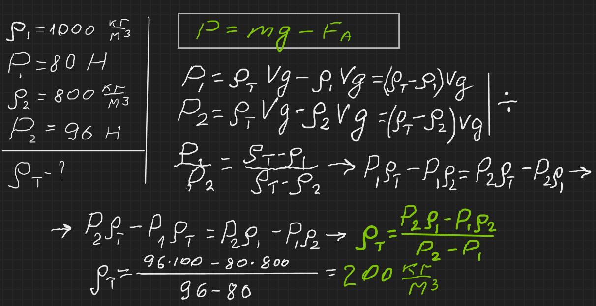 Однорідне тіло у рідині густиною р=1000 кг/м3 важить P = 80H, а у рідині густиною, =800 кг/м3 його вага становить P2 = 96 Н. Визначити густину тіла.