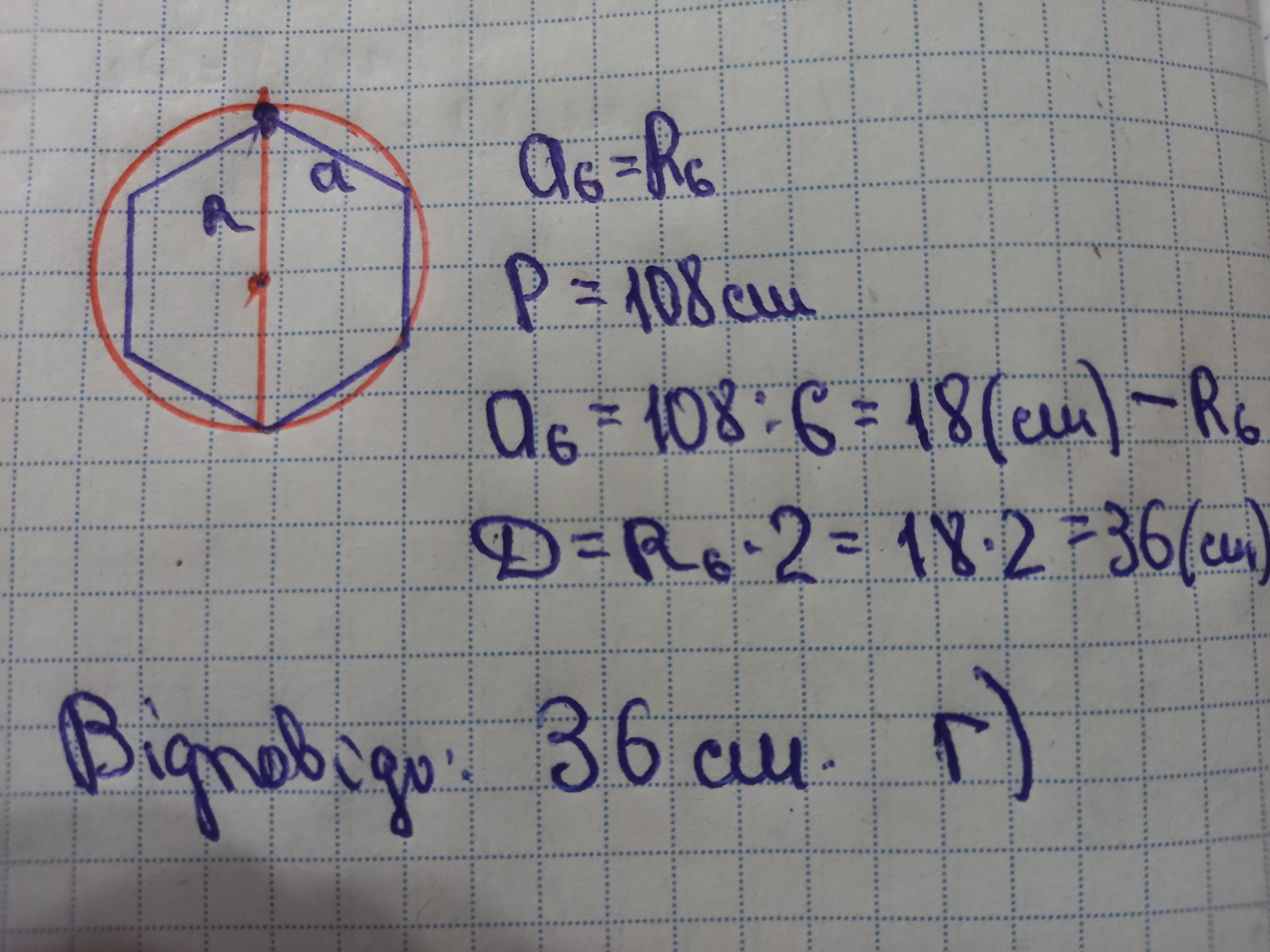 Периметр правильного шестикутника дорівнює 108см.Знайдіть діаметр описаного навколо нього кола. А) 9СМ Б) 18СМ